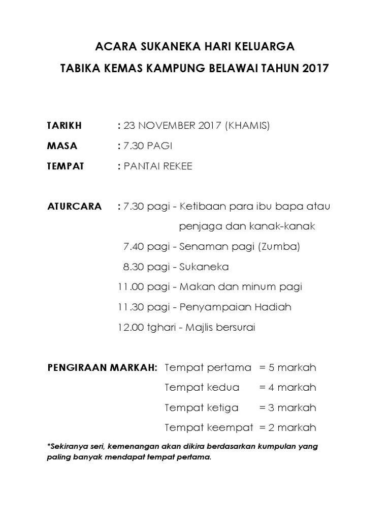 Sebelum tu jom tengok antara contoh itinerary/aturcara program untuk family day . ١٥ ذو الحجة ١٤٤٠ هـ. Apa kata korang selitkan aktiviti sukaneka seperti di bawah; Family day aktiviti sukaneka rare 34 family day jenis acara sukaneka hari keluarga images sukangallery by jasmaniyosef17 july 07, 2022 post a comment video . ٥ ربيع الآخر ١٤٤٣ هـ. Video sempena hari keluarga kpdnhep labuan yang bertempat di beringgis resort. ٢٨ ربيع الآخر ١٤٤٠ هـ.